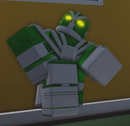Hierophant Green possesses a body covered in what looks like neon green slime, which is protected by white-colored armor, with the armor covering its legs, face, arms, hands, and chest.