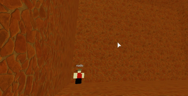 Inside there is Nado, a joke NPC with a bright smile on his face. The room is made of brick-like(?) material/texture with an orange color. Although the room is very big, the room has literally nothing inside it besides Nado.
